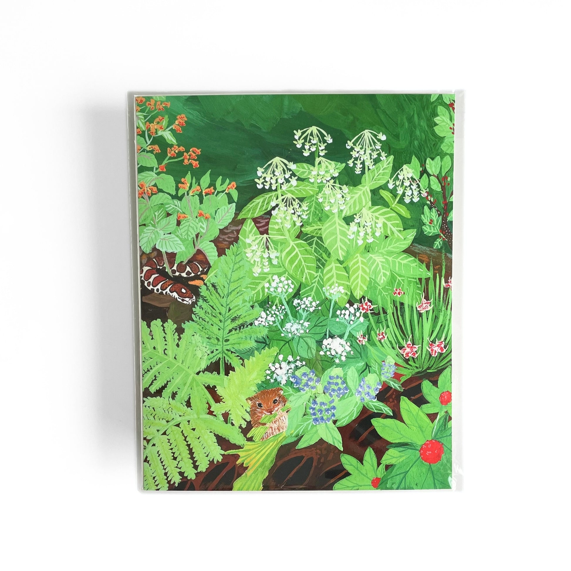 'Herbivore Resistors' features a native plant community from our 2025 guide, Gardening for Biodiversity in collaboration with artist and author, Julian Plum. The painting includes native species such as spicebush, poke milkweed, white snakeroot, and more.