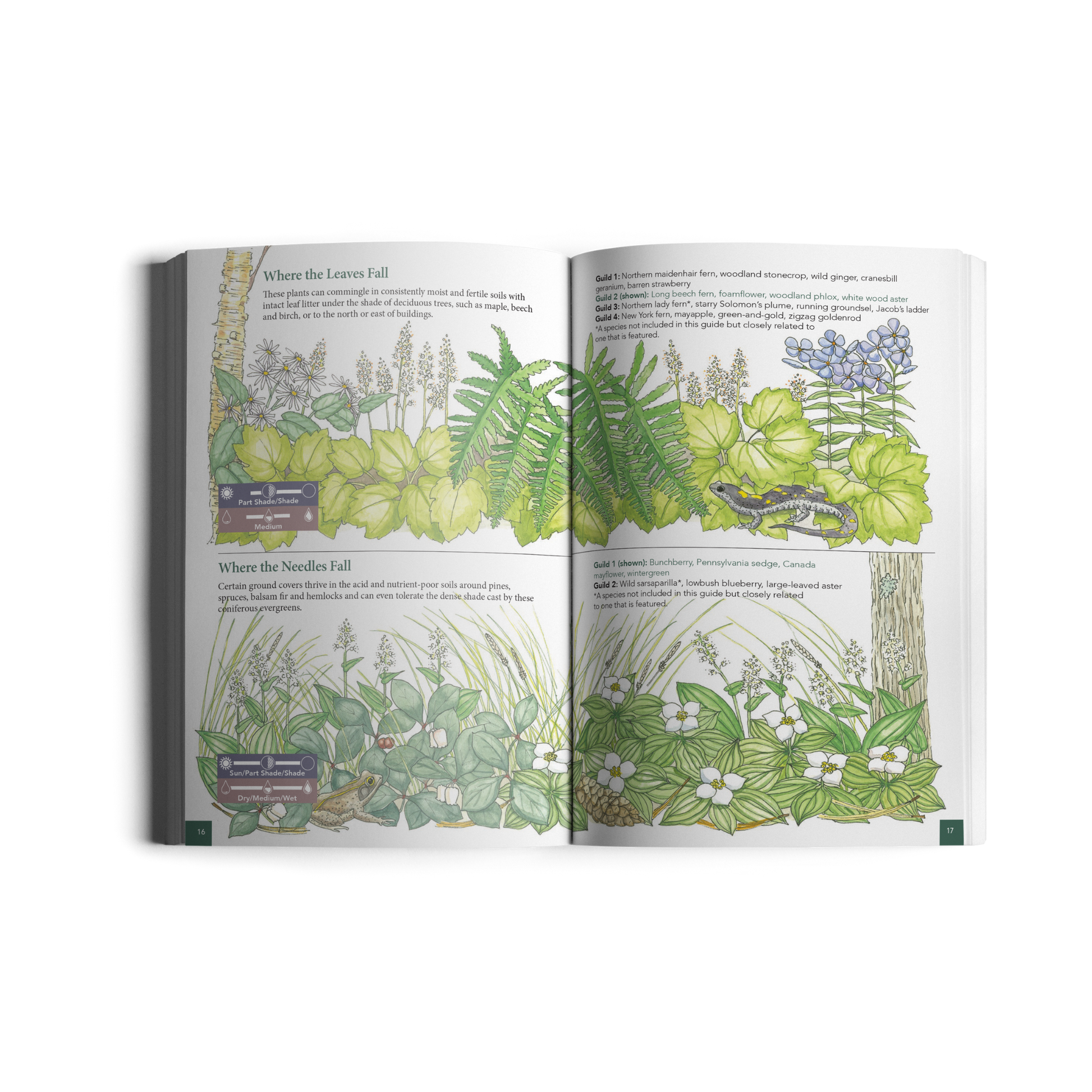 - Six illustrated guilds of ground cover combinations designed for different conditions